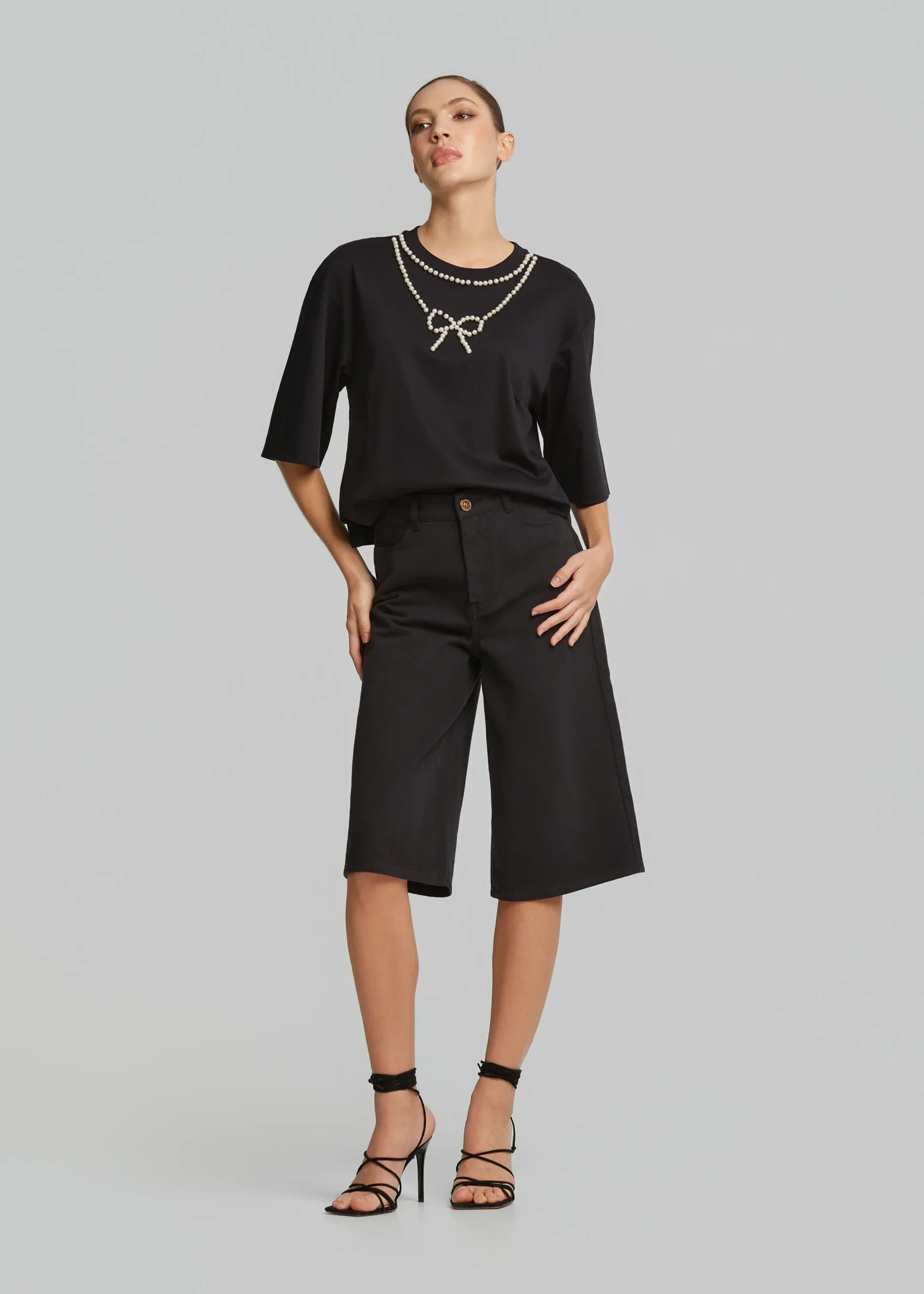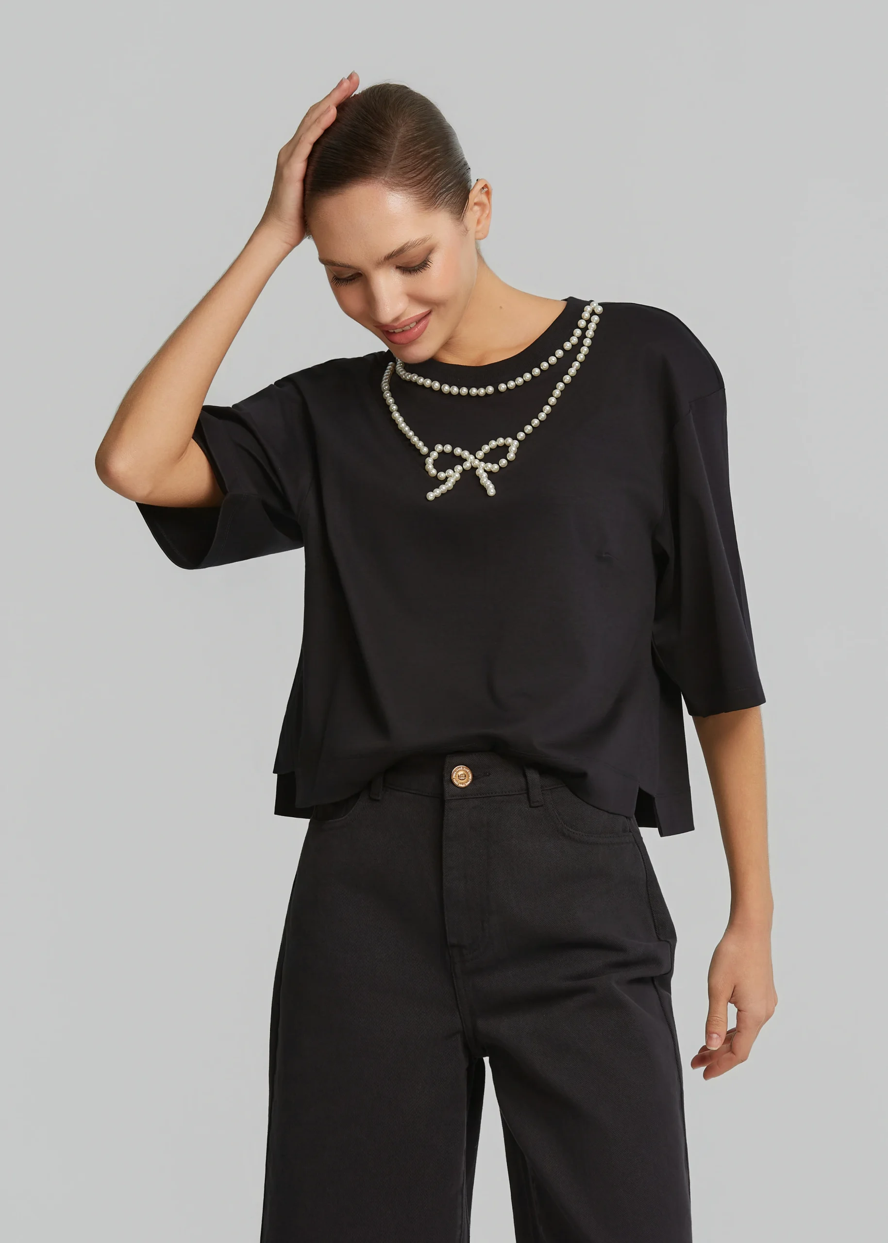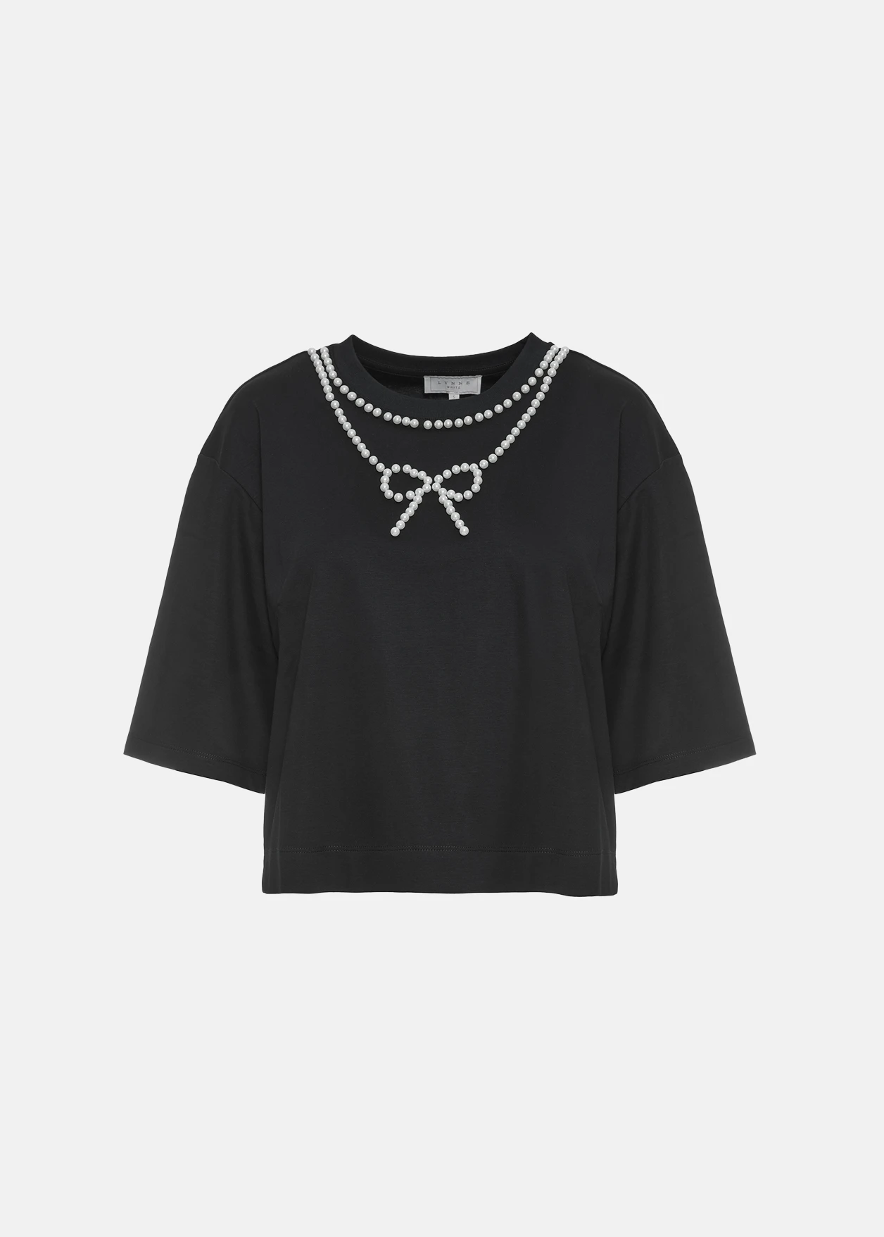 - Crop top with decorative pearl bow and comfortable fit