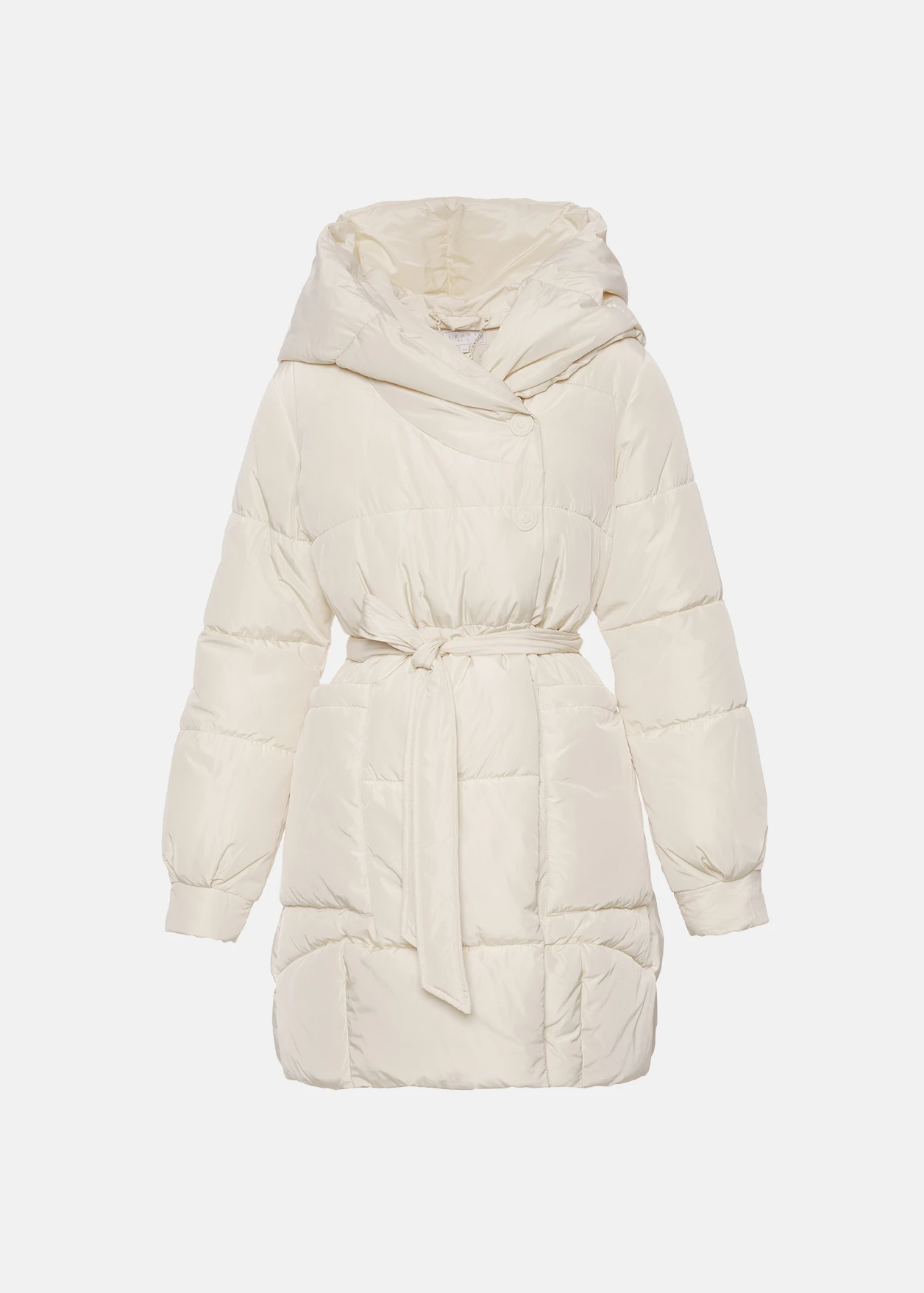 - Jacket with a pronounced mid-length hood and detachable belt