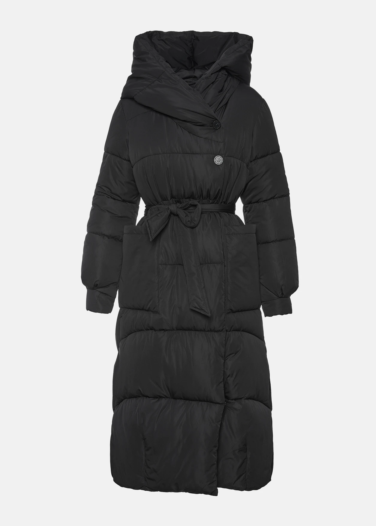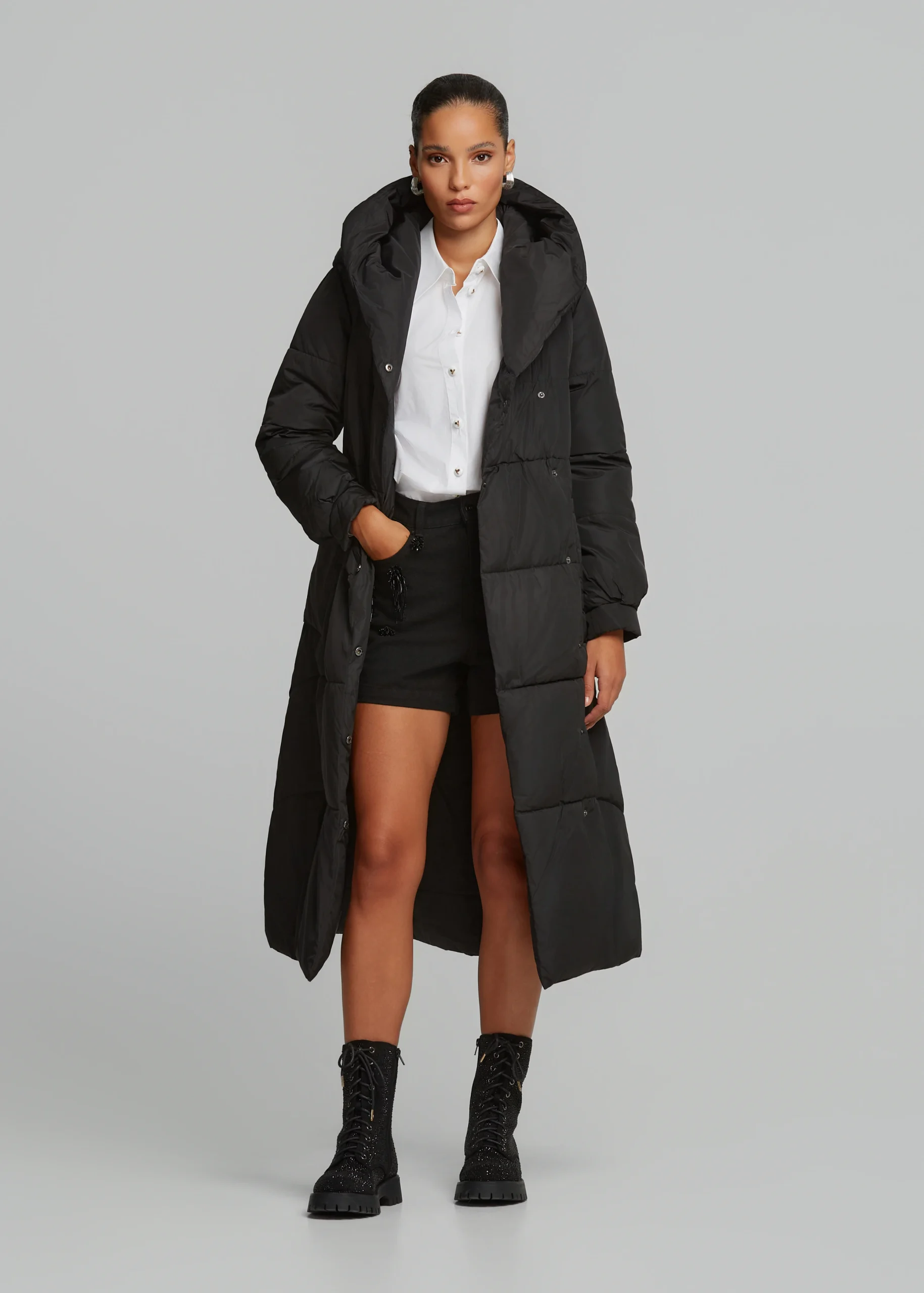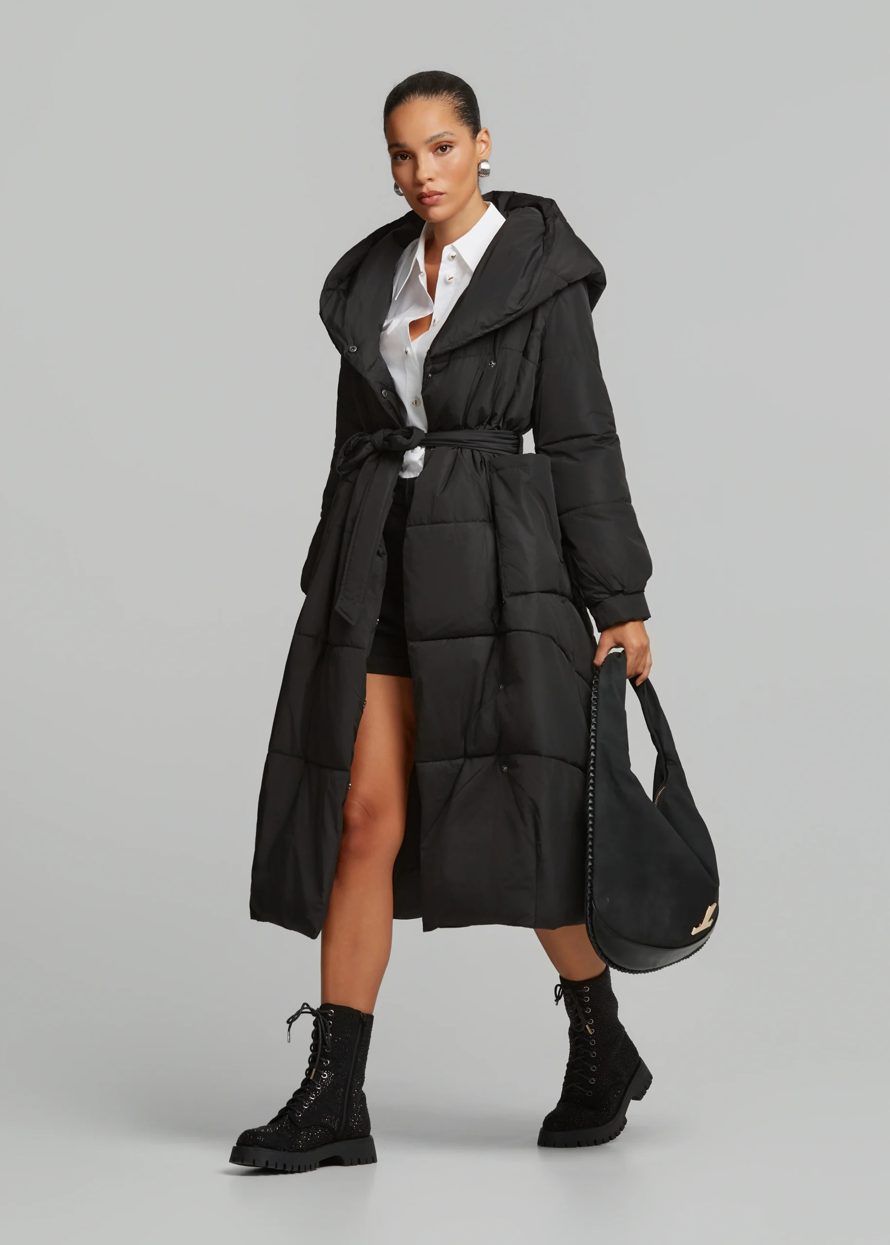• Long jacket with high collar and hood, side pockets and detachable belt
