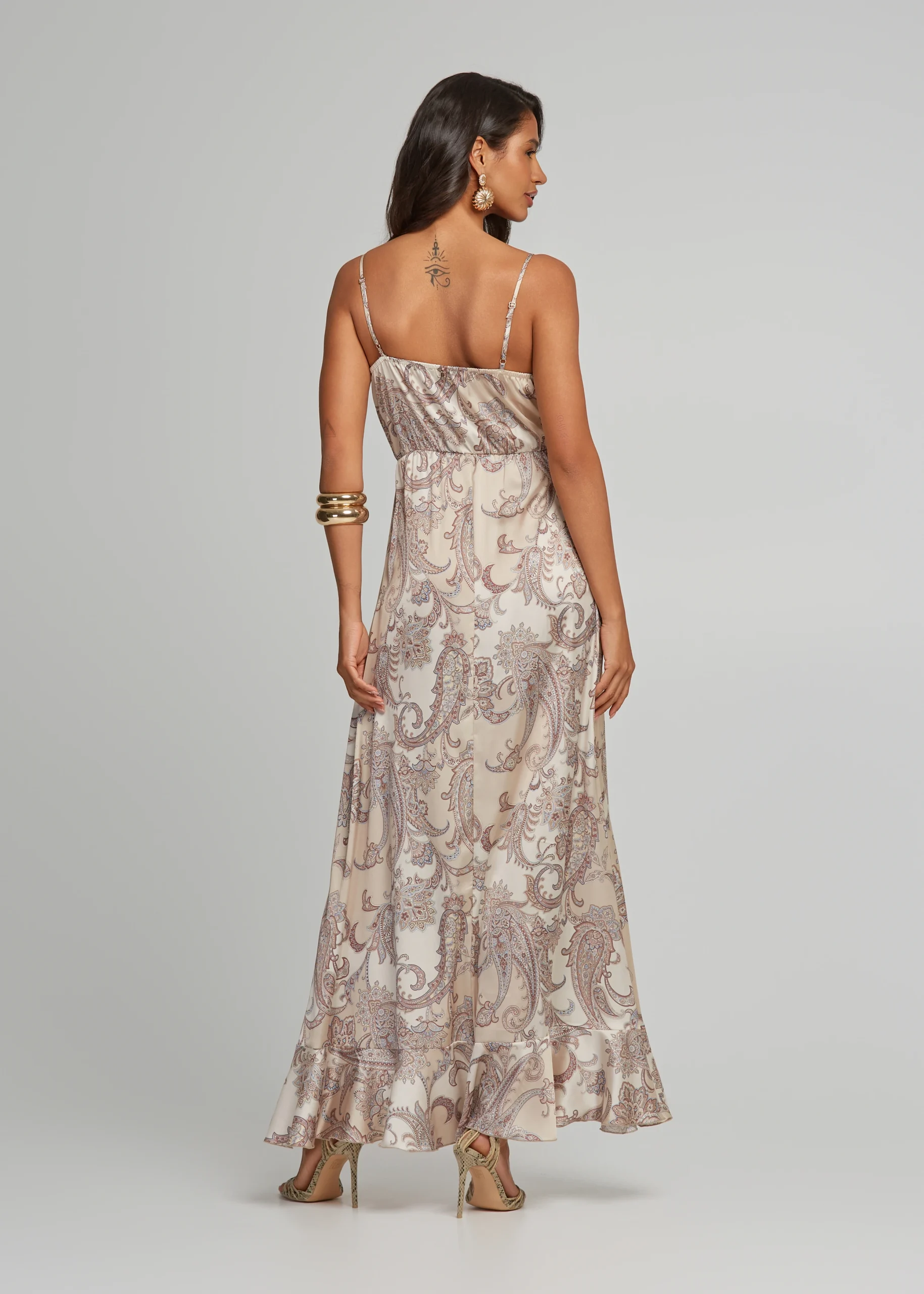 - Maxi dress with a satin look and a slit and ruffles
