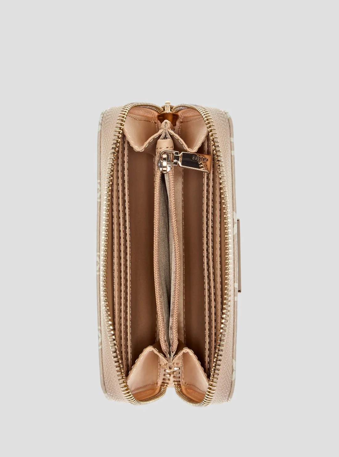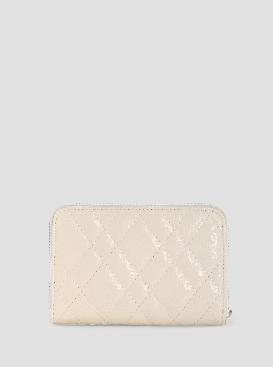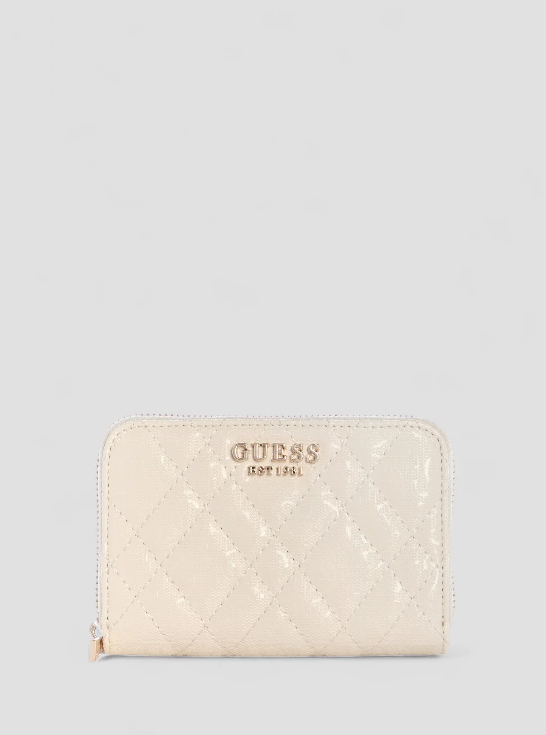 Keep your essentials neatly organised with the White Isemay Medium Zip Around Wallet. Crafted from quilted G-shine PU, this elegant compact wallet features six card slots, two slip pockets, and a central zip pocket for coins. Finished with a secure zip-around closure and subtle GUESS logo detailing, it’s a sleek and stylish accessory for everyday use.