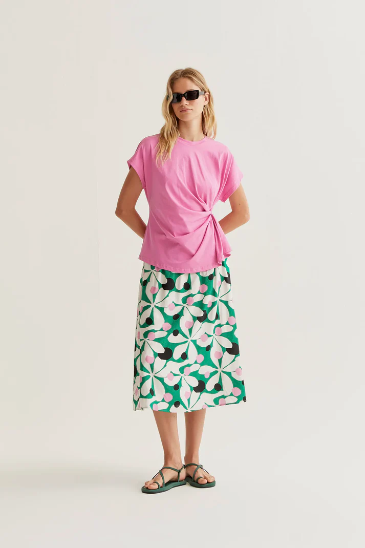 Pink 100% cotton T-shirt. Round neck and short sleeves. Draped waist with side knot. The model is 177 cm tall and wears size S.