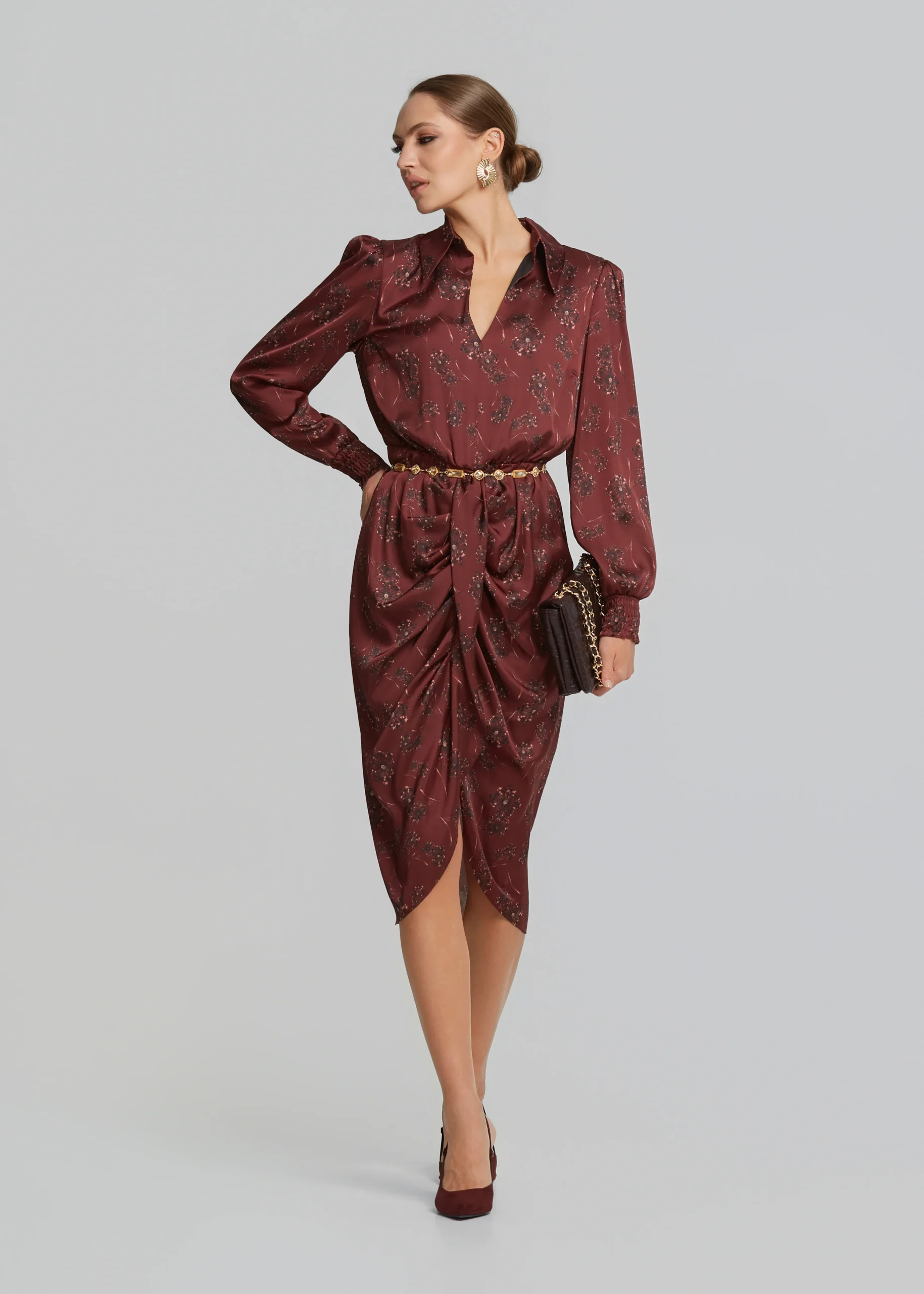 - Printed midi dress with ruffles and asymmetrical hem in satin look
