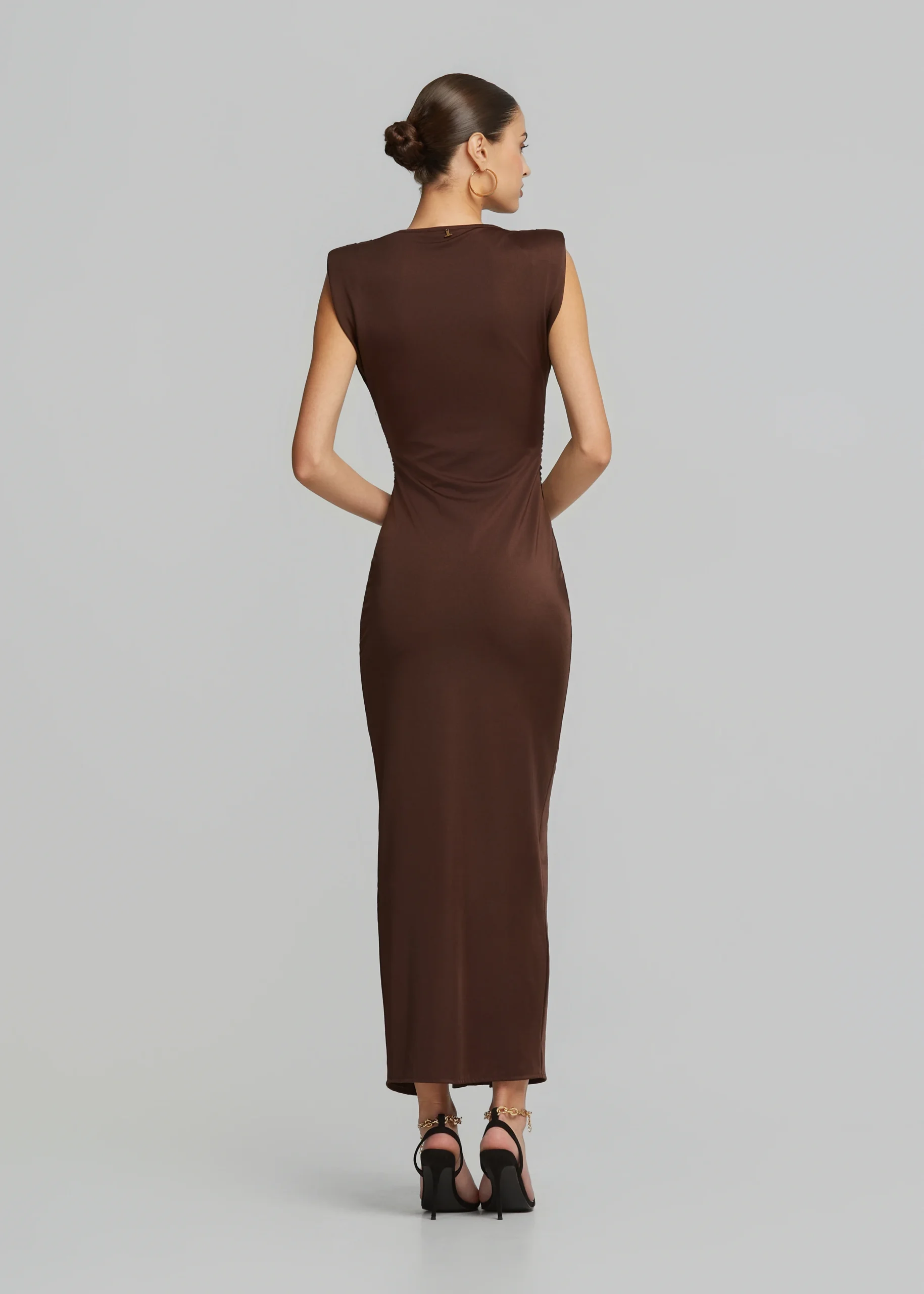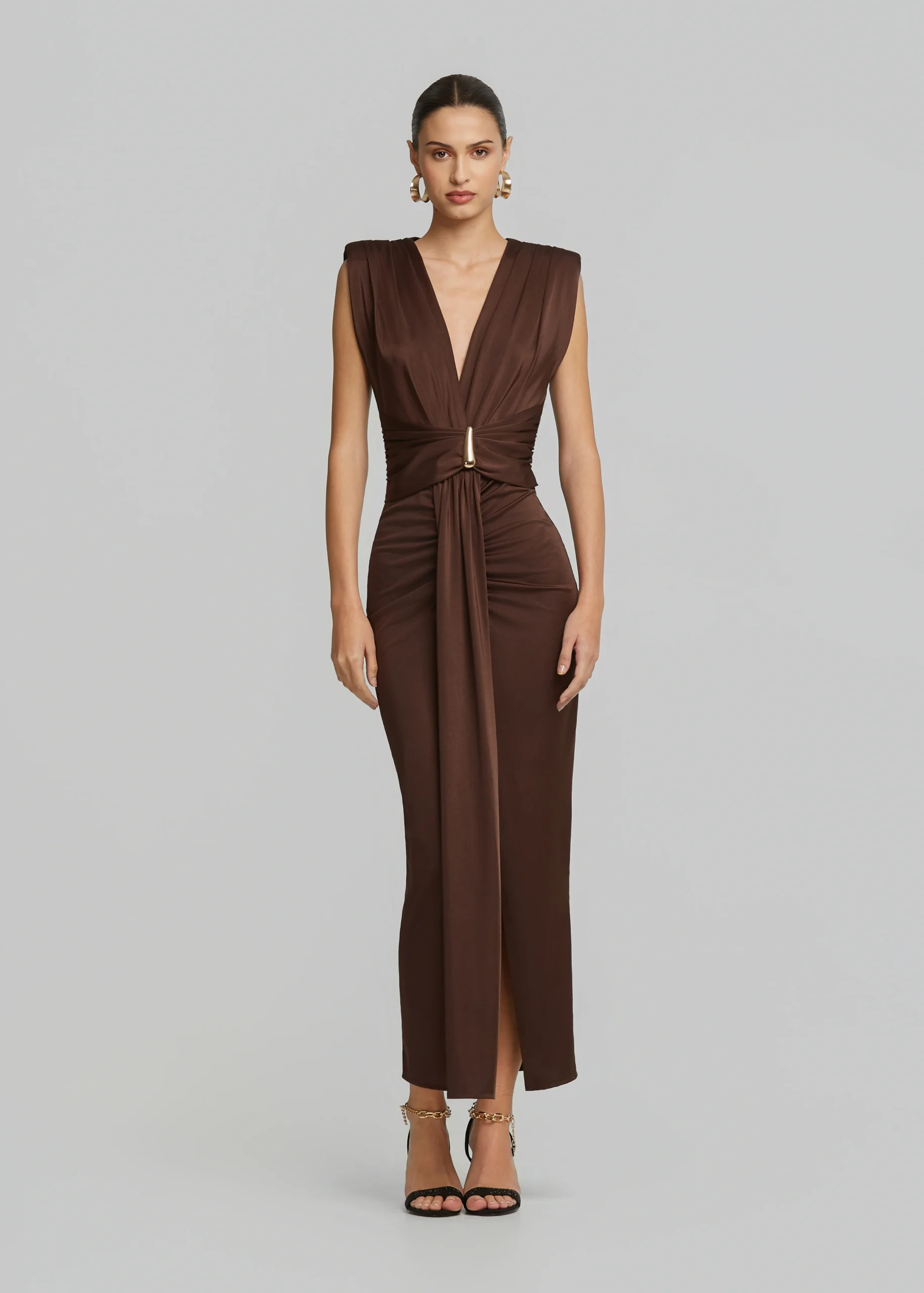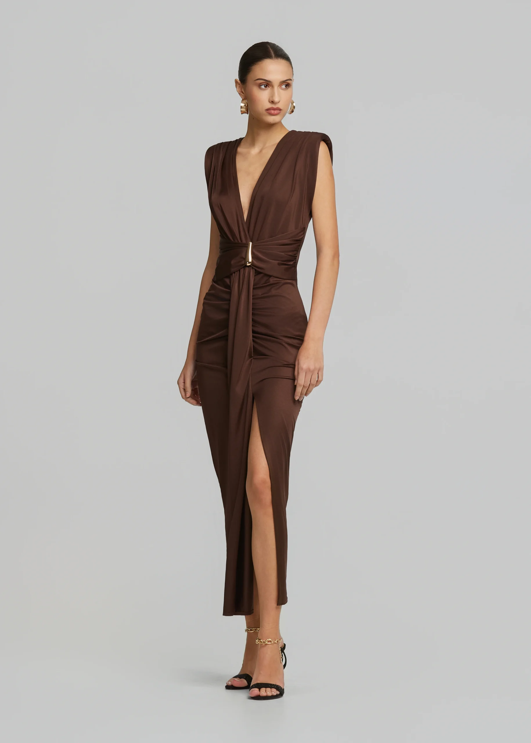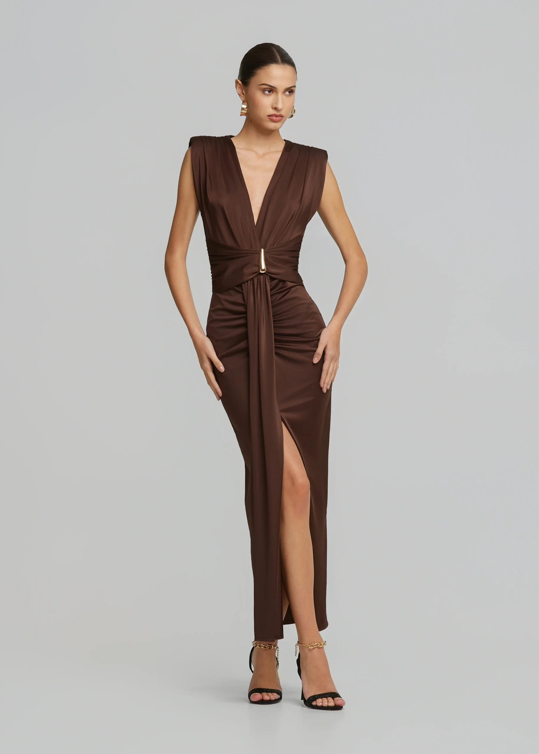 • V-neckline, metallic detail, bold shoulders and side slit