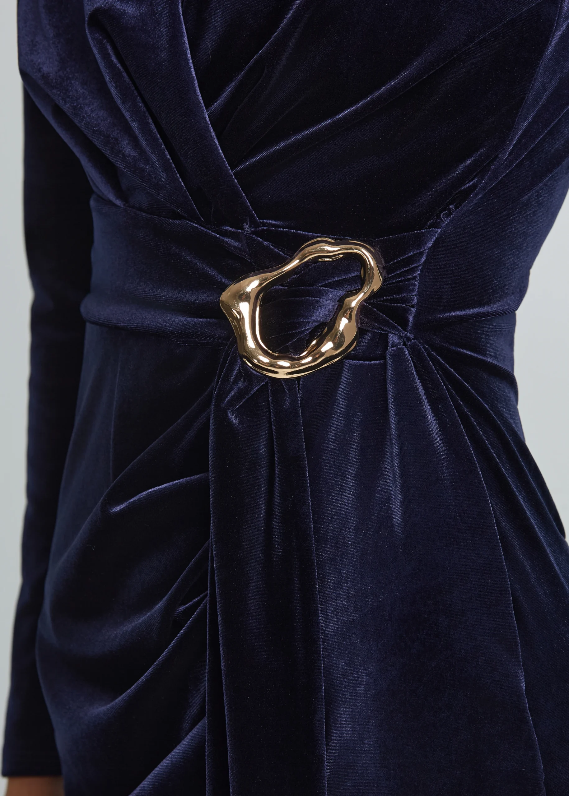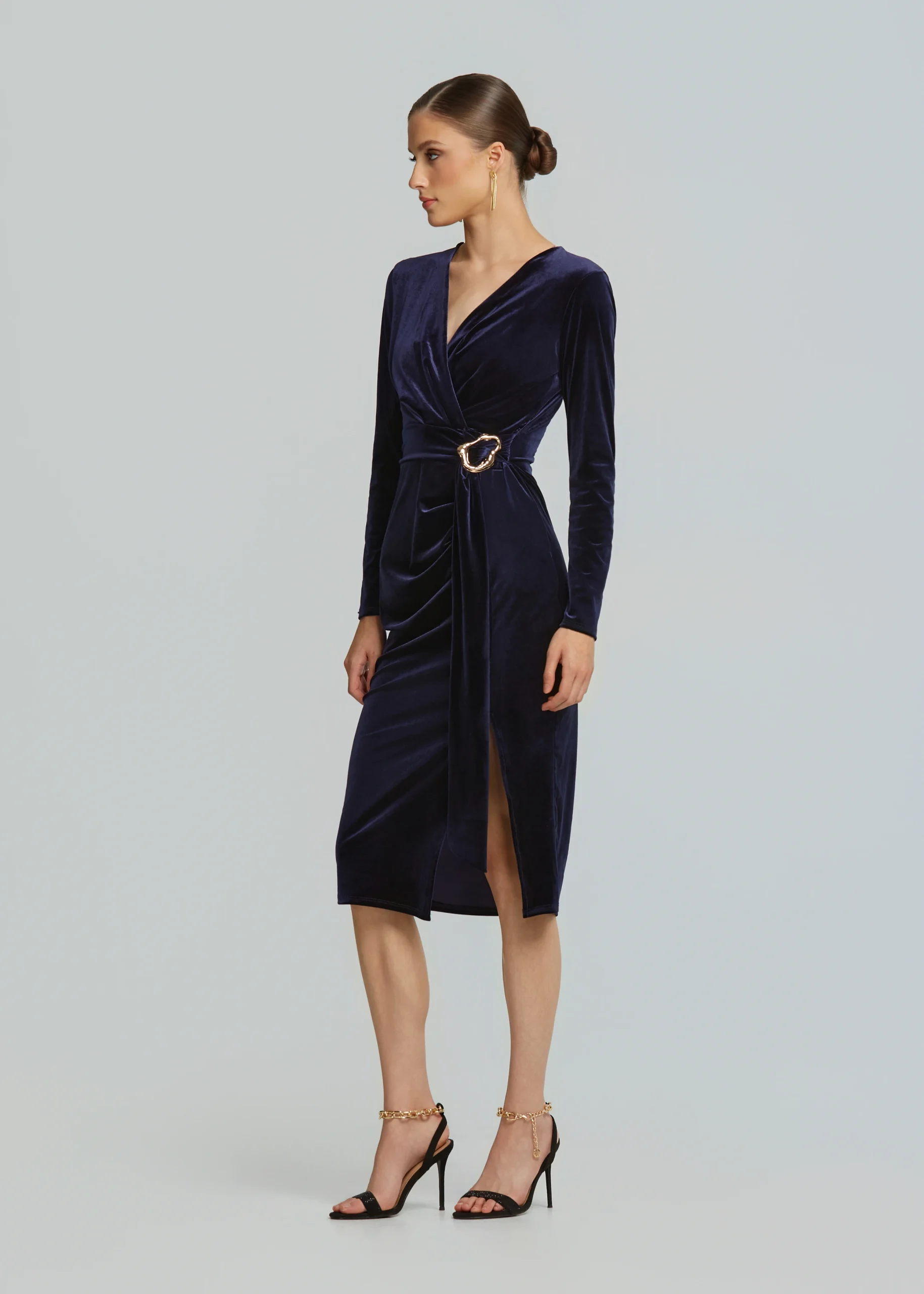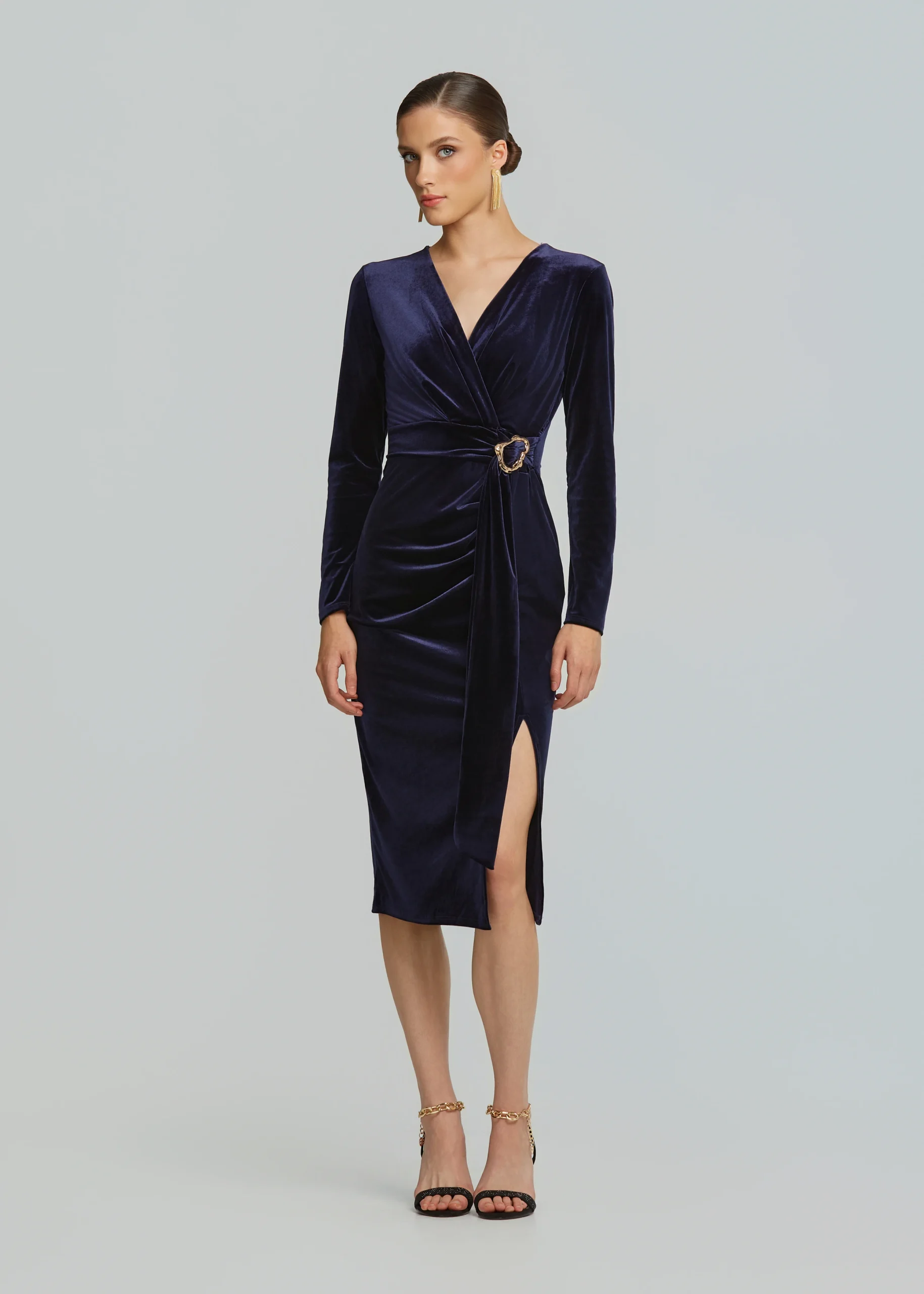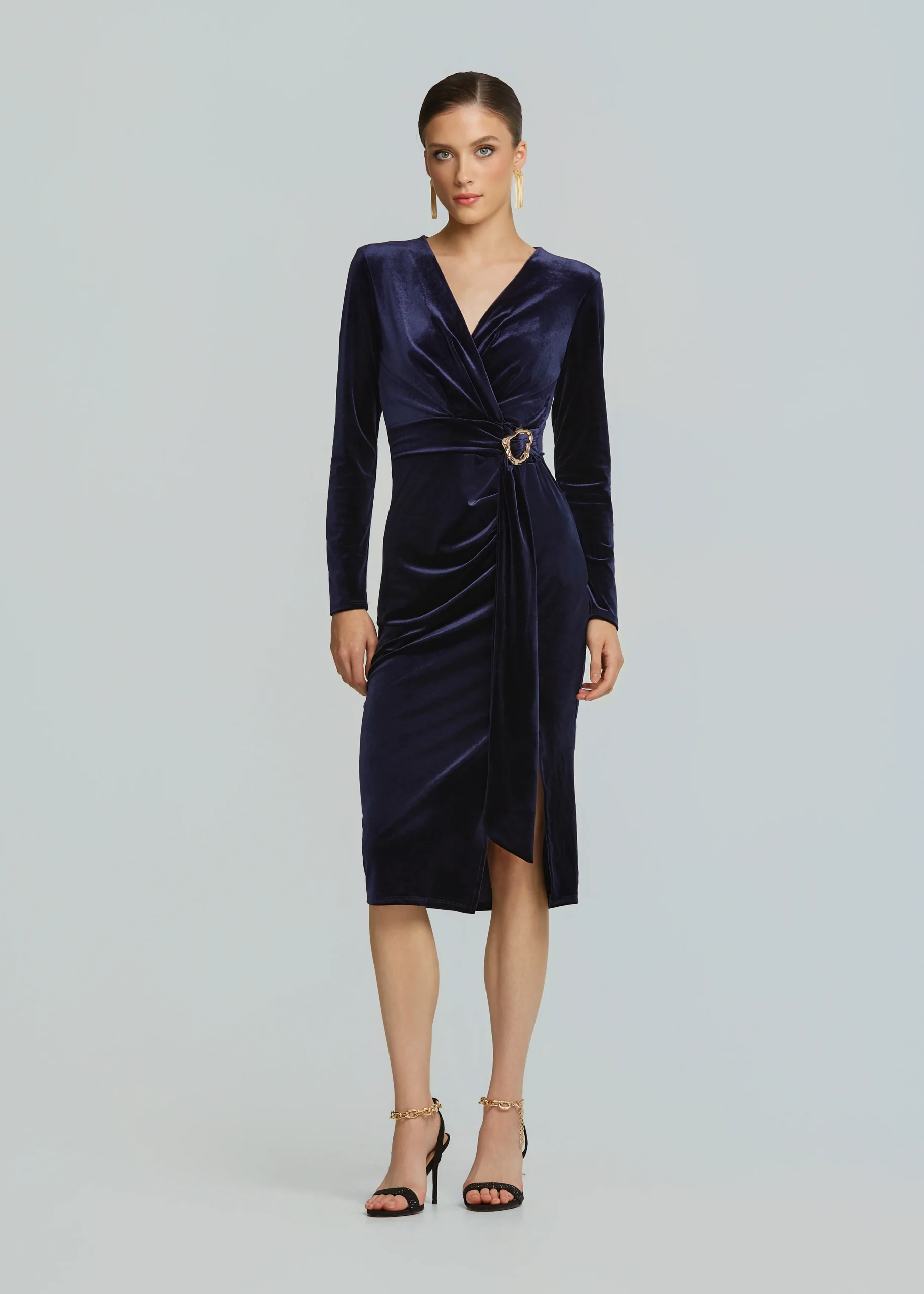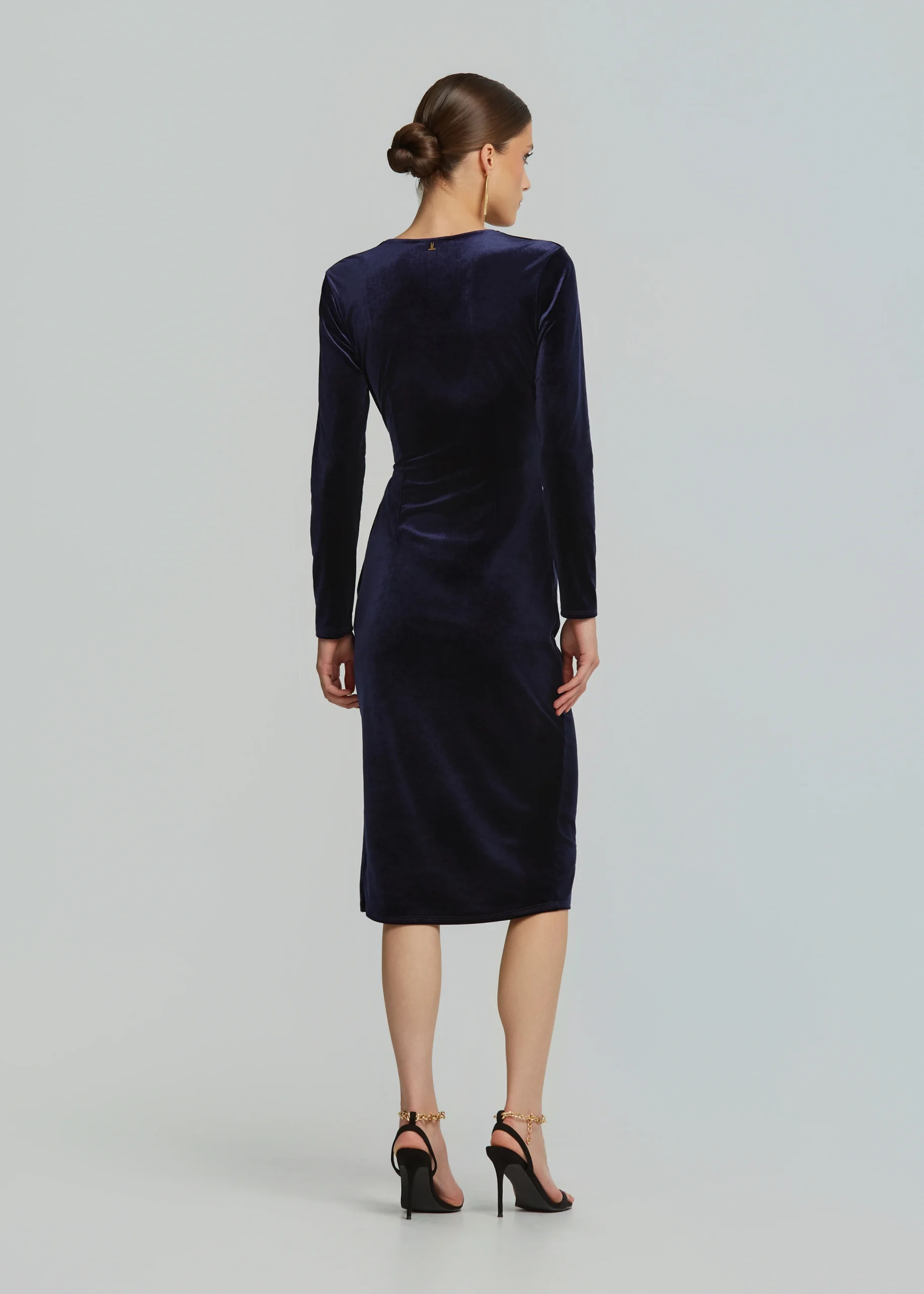 - Midi fitted dress with velvet look and gold metallic detail