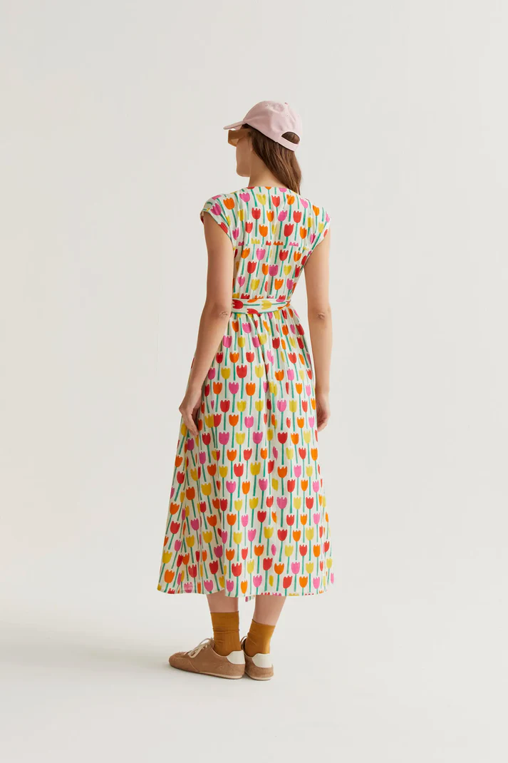 Long dress in 100% cotton with a tulip print. V-neck and sleeveless. Front closure with concealed buttons and a tie waist. Fully lined. The model is 177 cm tall and wears size S.