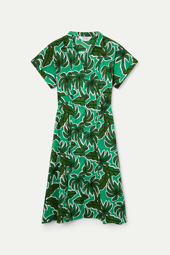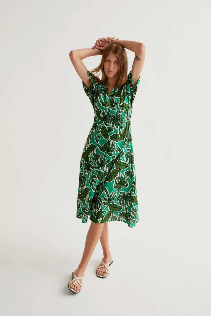 Μίντι φόρεμα με τύπωμα φοίνικα. Γιακάς με πέτα και λαιμόκοψη V. Κοντά μανίκια και κλείσιμο με κουμπιά μπροστά σε πράσινο χρώμα. Λεπτομέρεια με λάστιχο στη μέση. Πλαϊνές τσέπες. Το μοντέλο έχει ύψος 177 εκ. και φοράει μέγεθος S.