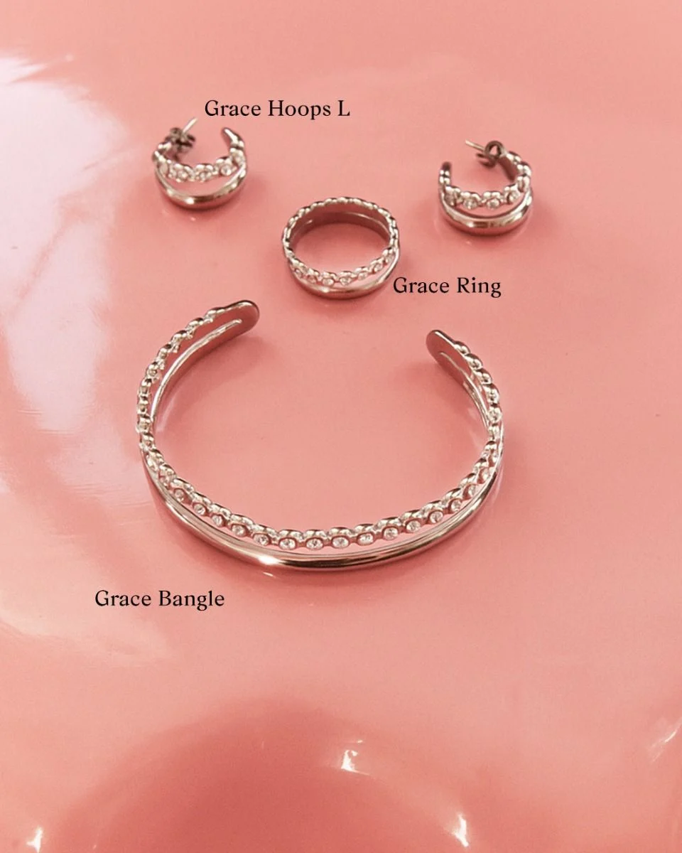 Η Grace είναι μια σειρά κλασικών κοσμημάτων με μια μοντέρνα πινελιά. Μια υπερκομψή, ευκολοφόρετη σειρά που συνδυάζει την απλότητα με την κομψότητα, για εκείνες τις ξεχωριστές περιστάσεις όπου μόνο μια πινελιά λάμψης αρκεί. Εδώ φαίνεται σε ένα δαχτυλίδι από λαμπερό ανοξείδωτο ατσάλι με δύο λουράκια, ένα με λαμπερές πέτρες και ένα χωρίς, που μοιάζουν με δύο δαχτυλίδια όταν είναι στη θέση τους.