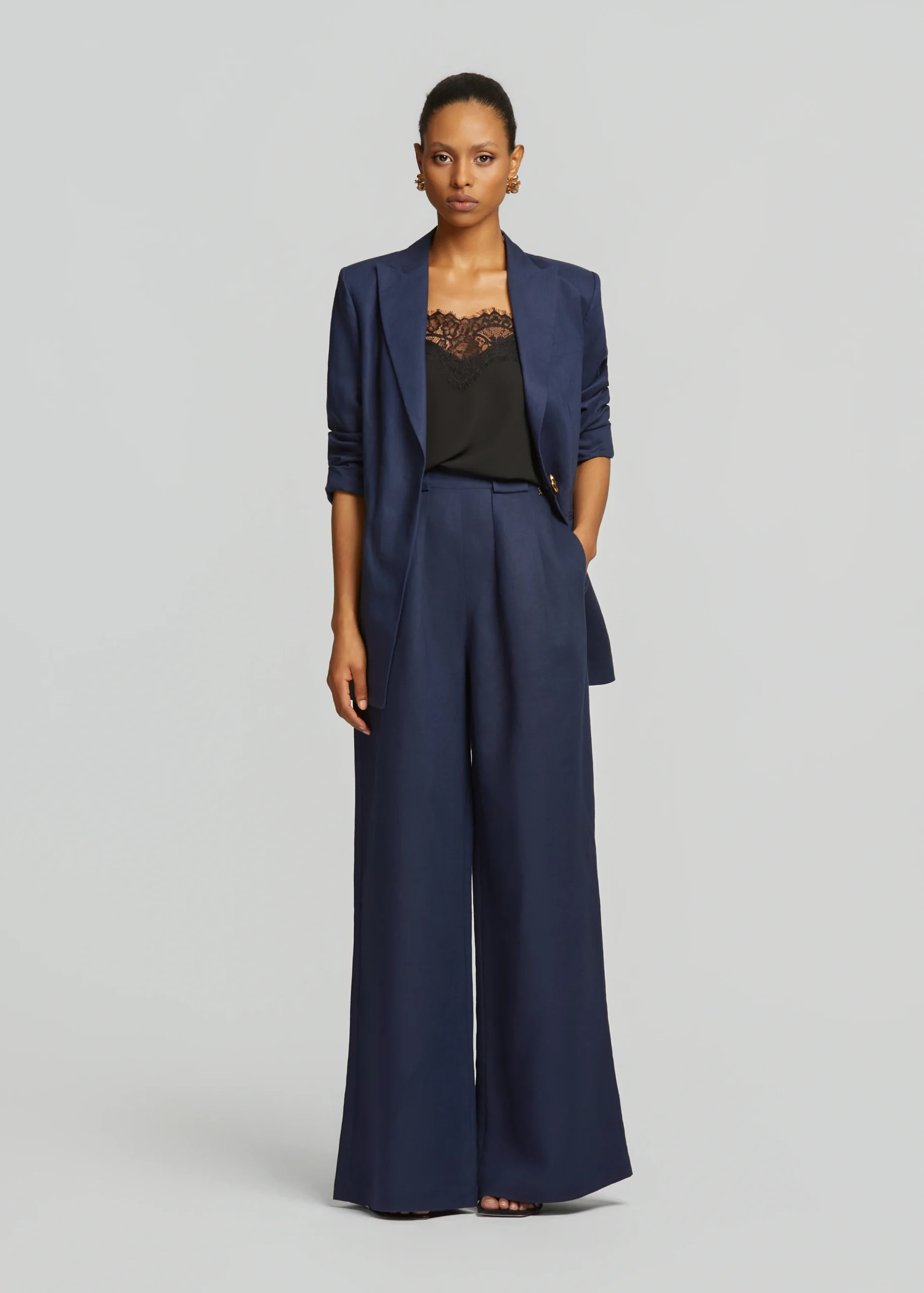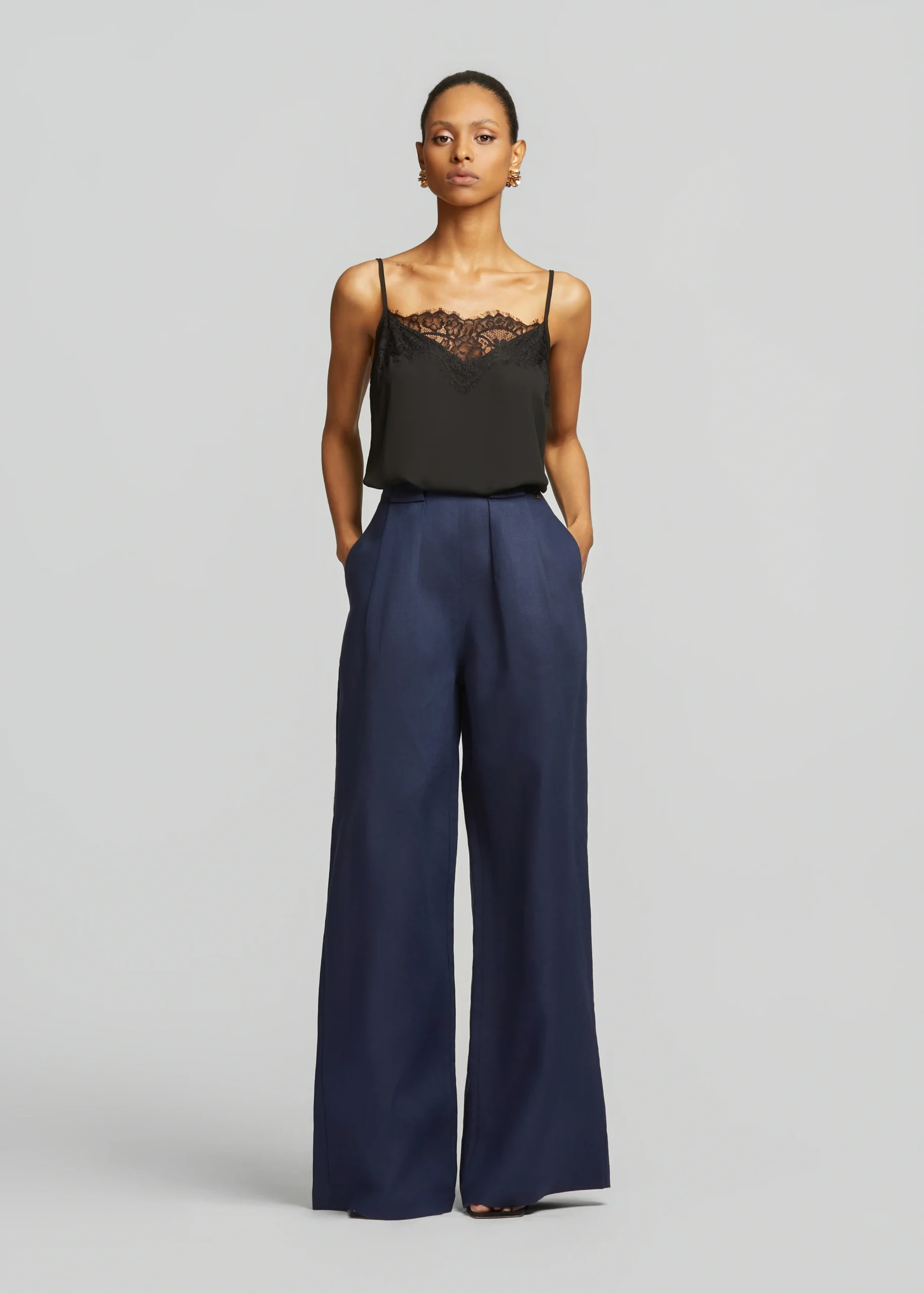 - Λινό ίσιο παντελόνι με πιέτες και πλαϊνές τσέπες