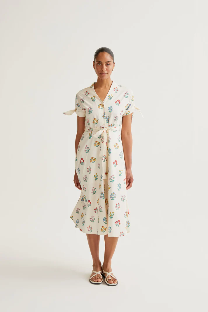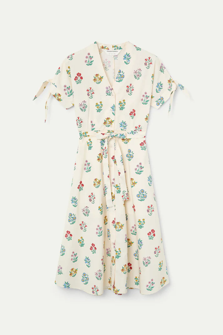 Μίντι φόρεμα από 100% βαμβάκι με τύπωμα gardener. V ντεκολτέ και κοντά μανίκια με λεπτομέρεια δέσιμο. Κλείσιμο μπροστά με κουμπιά και λευκά κουμπιά και δέσιμο στη μέση. Φόδρα. Το μοντέλο έχει ύψος 173 εκ. και φοράει μέγεθος S.
