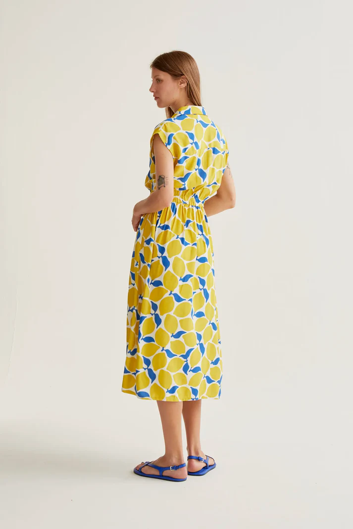 Φόρεμα με στάμπα Limoncello. Γιακάς με πέτα και αμάνικο. Κλείσιμο με κουμπιά μπροστά και κίτρινα κουμπιά. Ρυθμιζόμενη ελαστική μέση. Πλαϊνές τσέπες. Το μοντέλο έχει ύψος 177 εκ. και φοράει μέγεθος S.