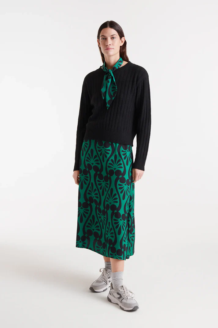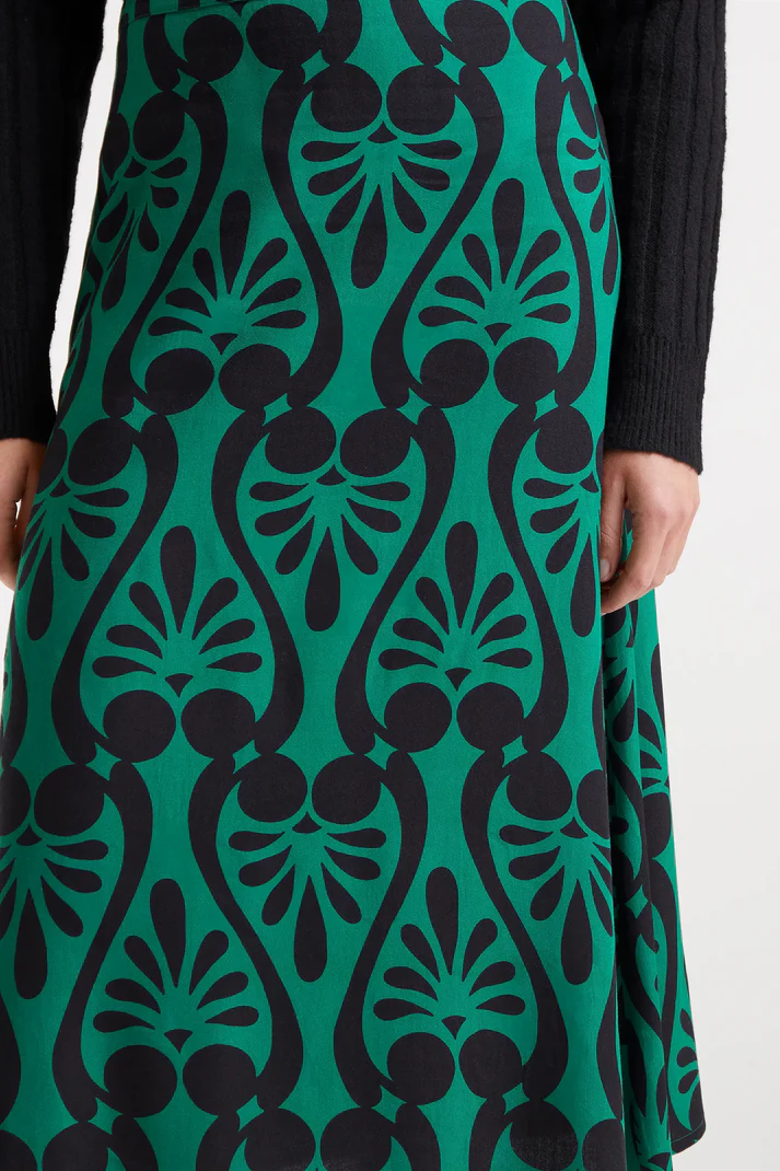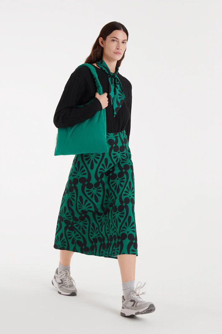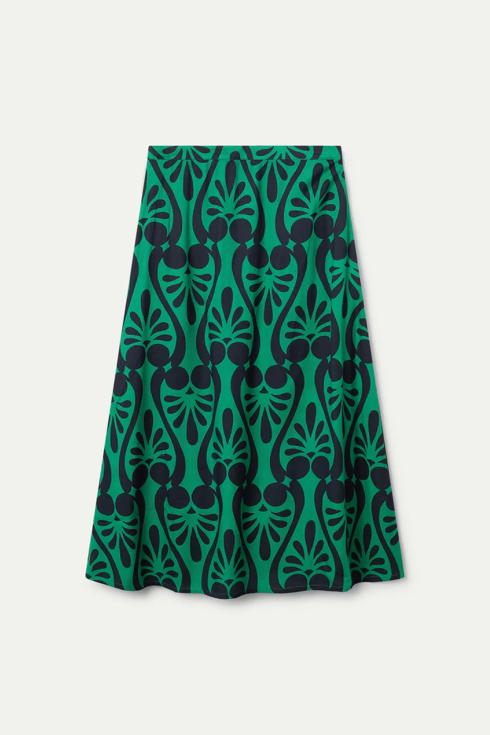 Φούστα μίντι με μπαρόκ τύπωμα. Ψηλόμεση, σταθερή ζώνη. Αόρατο κλείσιμο με φερμουάρ στο πλάι. Το μοντέλο έχει ύψος 177 εκ. και φοράει μέγεθος S.
