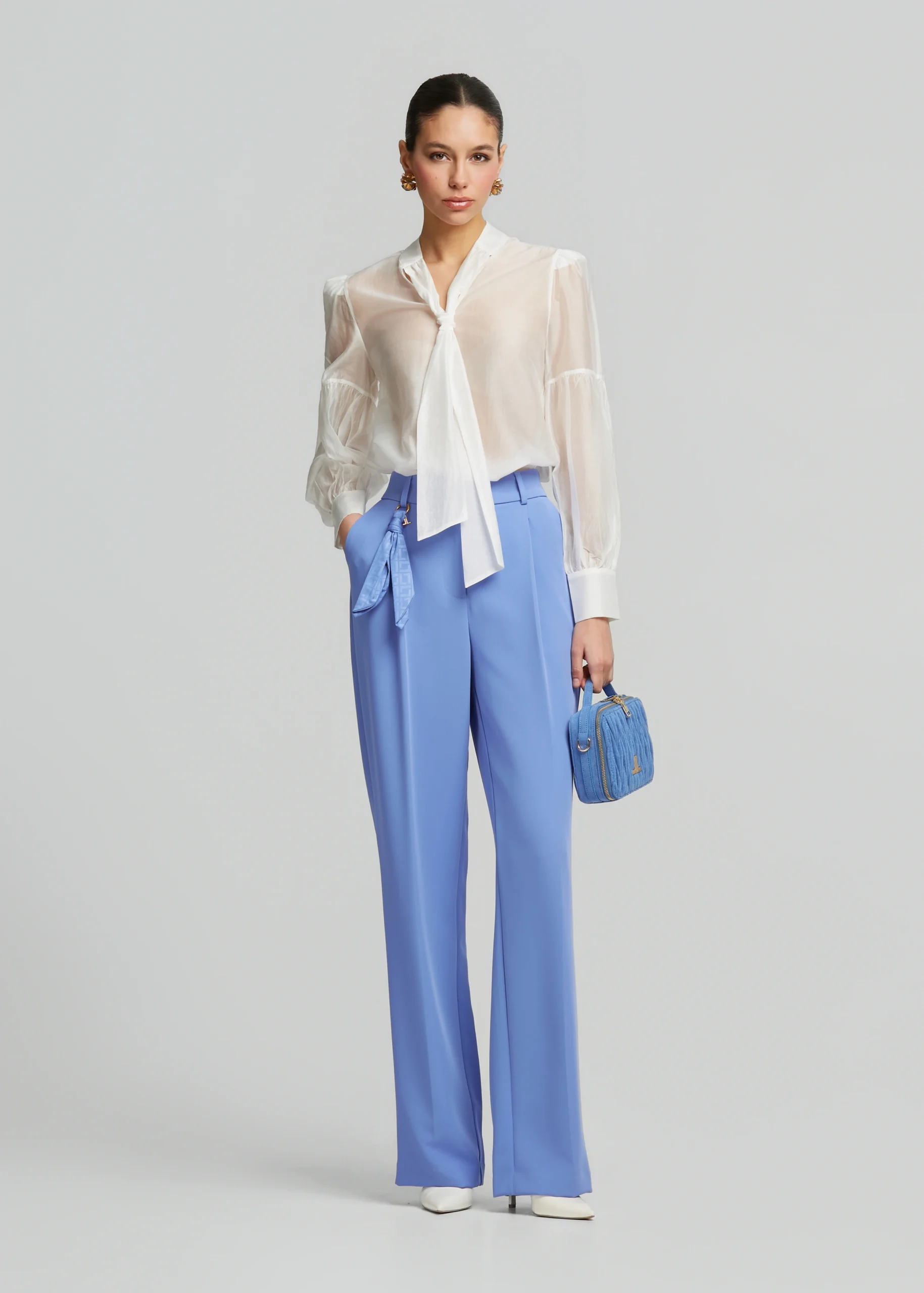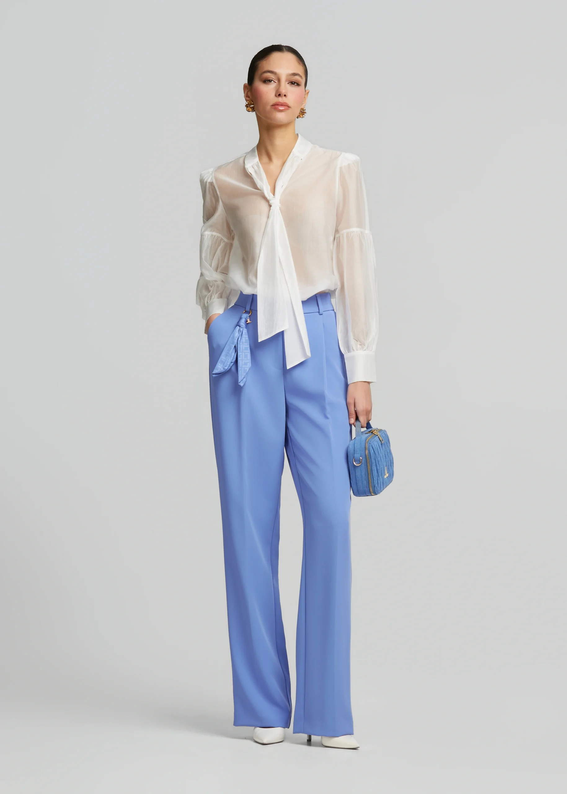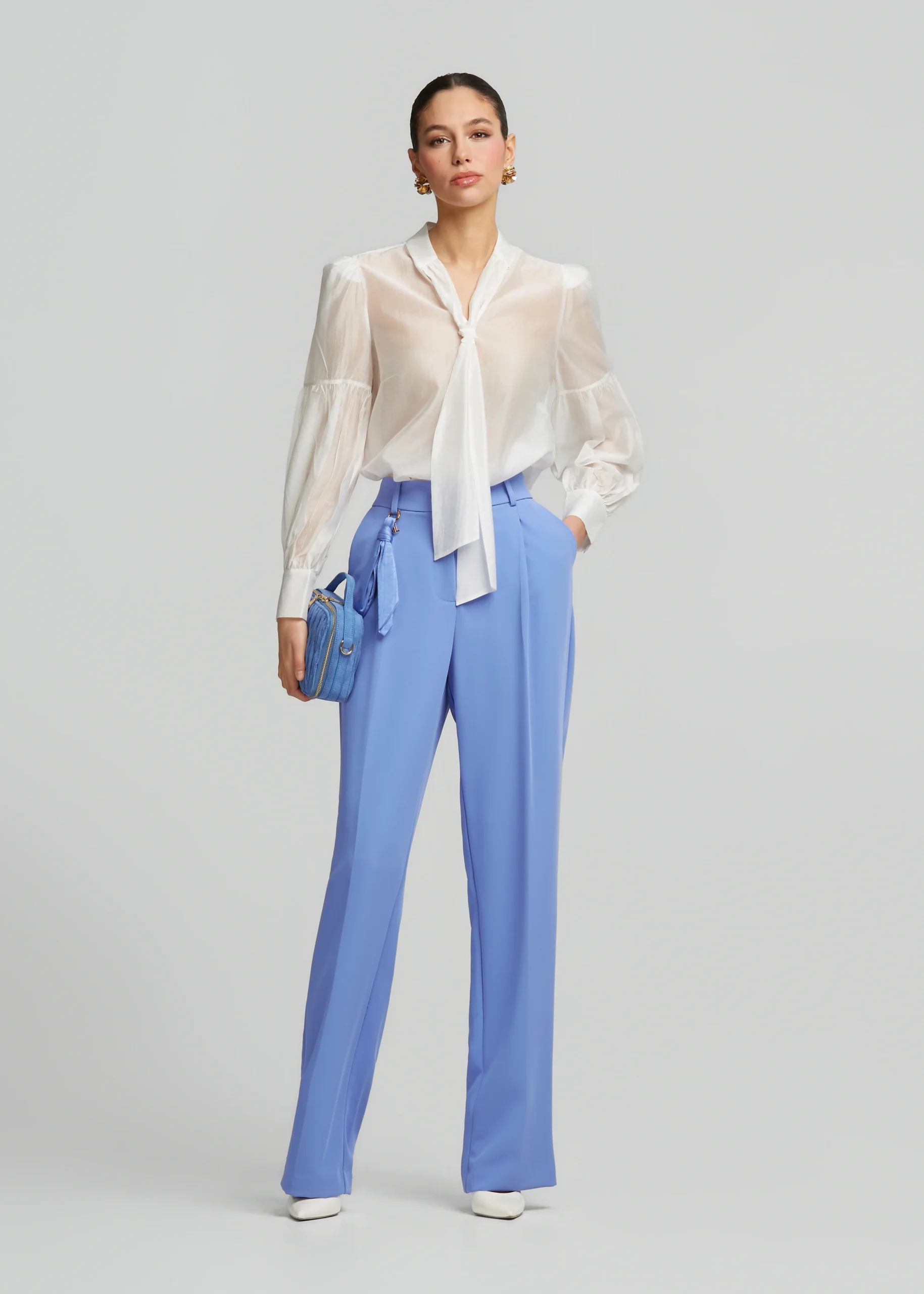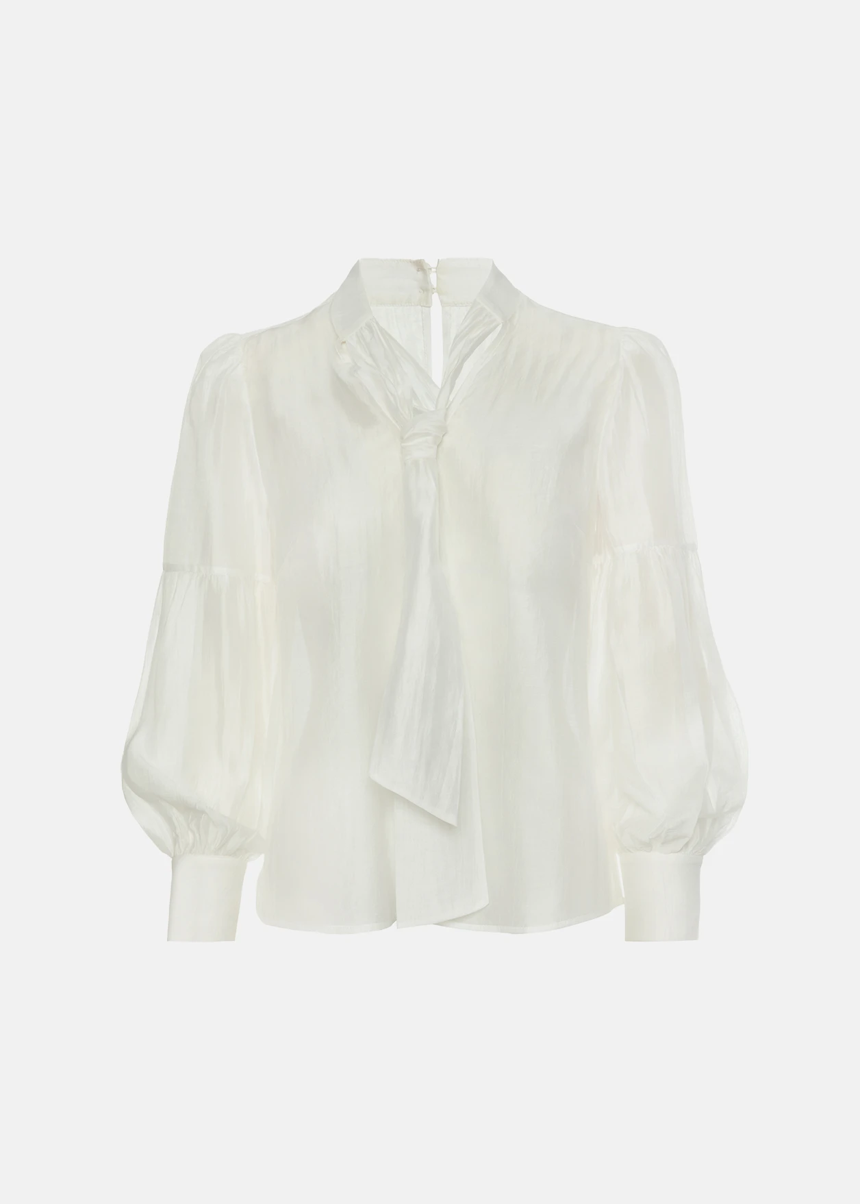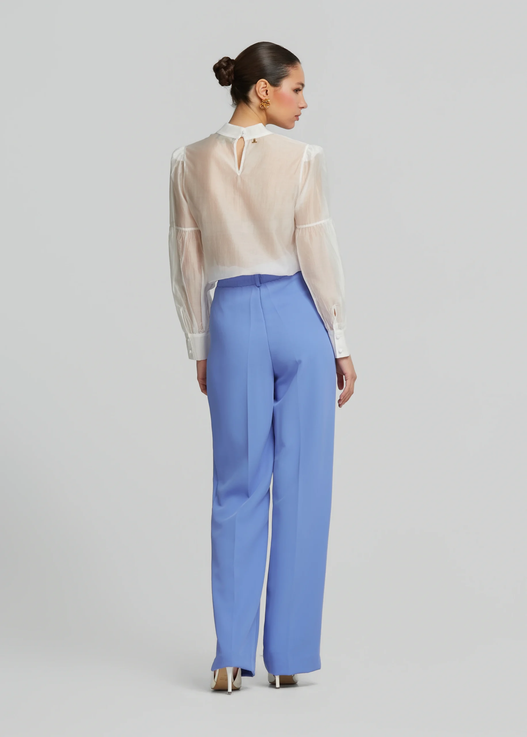 - Μπλούζα με δέσιμο στον λαιμό, έντονα μανίκια και κλείσιμο πίσω με κουμπιά