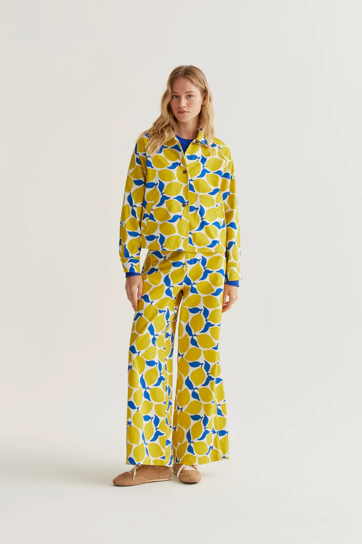 Μπουφάν από 100% βαμβάκι με τύπωμα limoncello. Γιακάς με πέτο και μακριά μανίκια με κουμπωτές μανσέτες. Ελαφρώς χαμηλωμένοι ώμοι. Πλαϊνές τσέπες. Το μοντέλο έχει ύψος 177 εκ. και φοράει μέγεθος S.